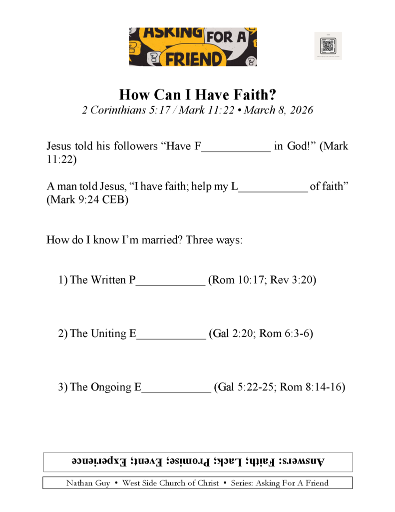 Sermon Notes Sermon Notes nathanguy.com Watch, Listen, or read past sermons here this week's sunday message (Mar 8) How Can I Have Faith? Mark 11:22 How can I have faith? How do I know that Christ is my Savior? How can I experience the abundant life? This Week's Sermon notes This Week's Discussion Guide Open Sermon Slides (PDF) (None) Watch, Listen, or Read Past Sermons Here TRY ALPHA!Sundays at 10:30 AMWest Side Church of Christ (Searcy, Arkansas)